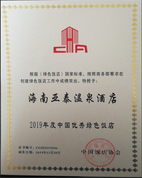 2019年11月28日,中国饭店协会根据《绿色饭店》国家标准,按照商务部要求对创建绿色饭店工作中成绩突出的酒店给予肯定,在此次评选中海南亚泰温泉酒店通过优异的表现,在众多酒店中突出重围,荣膺“2019年度中国优秀绿色饭店”荣誉称号。