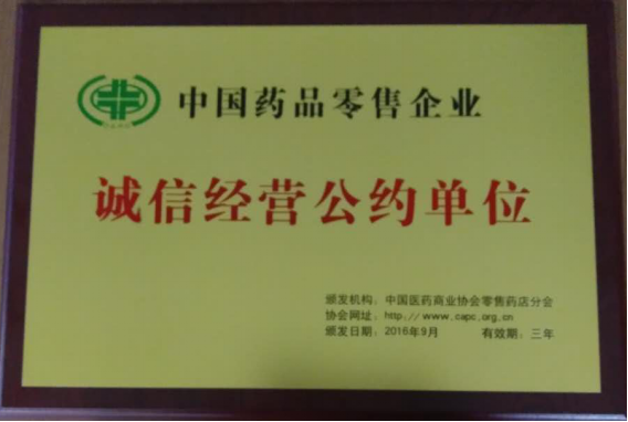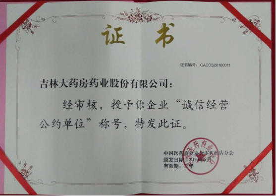2016年7月始,历时两个月的严格审核和评定,吉林大药房药业股份有限公司凭借规范的管理标准和诚信的经营理念,最终获得“中国药品零售企业诚信经营公约单位”殊荣,并被授予奖牌和证书。