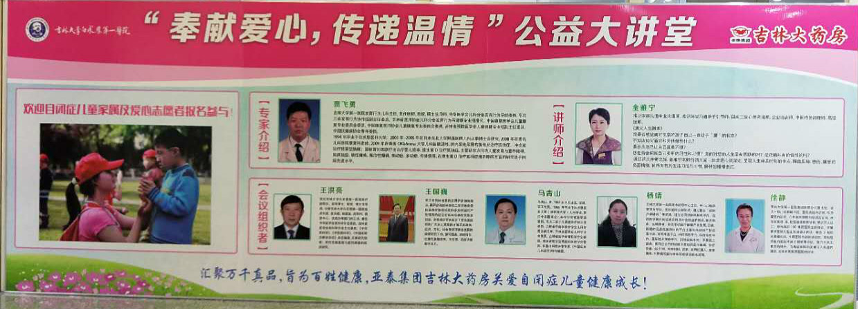 自闭症就像一场无尽头的遭难折磨着无数的家庭,吉林大药房对此尤为关注。 1月17日,吉林大药房参与组织了由吉林大学白求恩第一医院主办“奉献爱心,传递温情”公益大讲堂活动,邀请专业领域的知名专家和爱心人士陪伴大家,共同直面“自闭症患儿的家长作用”,让我们以开放的态度学习并且尽快学会如何与自闭症孩子生活。