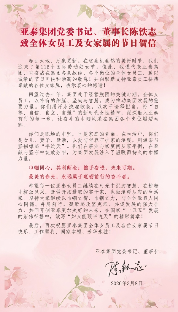 亚泰集团党委书记、董事长陈铁志 致全体女员工及女家属的节日贺信