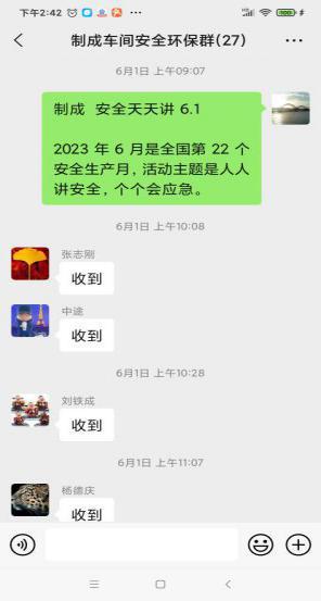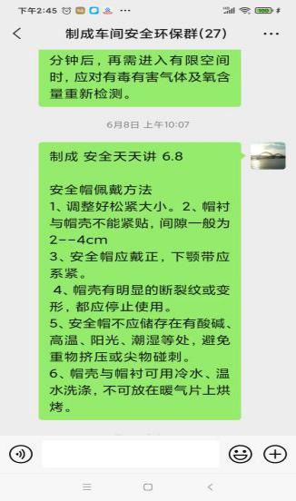 在今年的安全生产月期间,针对员工共同关注的职业卫生、工伤等问题,车间利用微信群,开展“安全天天讲”活动,重点讲述《职业病防治法》、《工伤保险条例》中涉及个人的相关知识。以此方式转变员工的旧认知,使其对安全管理有新认识,为检验此次活动的效果,车间结合产业集团二季度安全教育培训课件,通过安全教育培训考试进行验收,合格率100%。